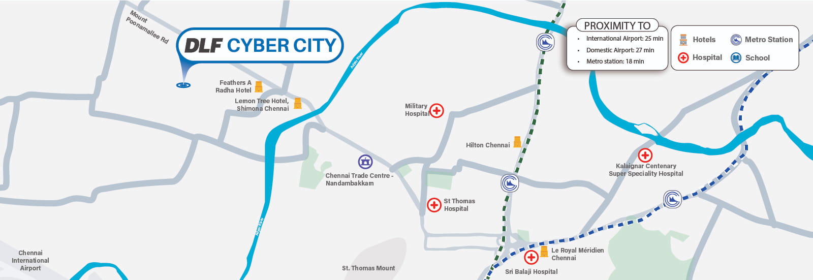 DLF Cyber City Chennai, strategically located off Mount Poonamallee Road, offers seamless connectivity to major city centers. With a robust road network and thriving social infrastructure, it ensures easy access to premium residential areas, retail hubs, and top hospitality destinations.