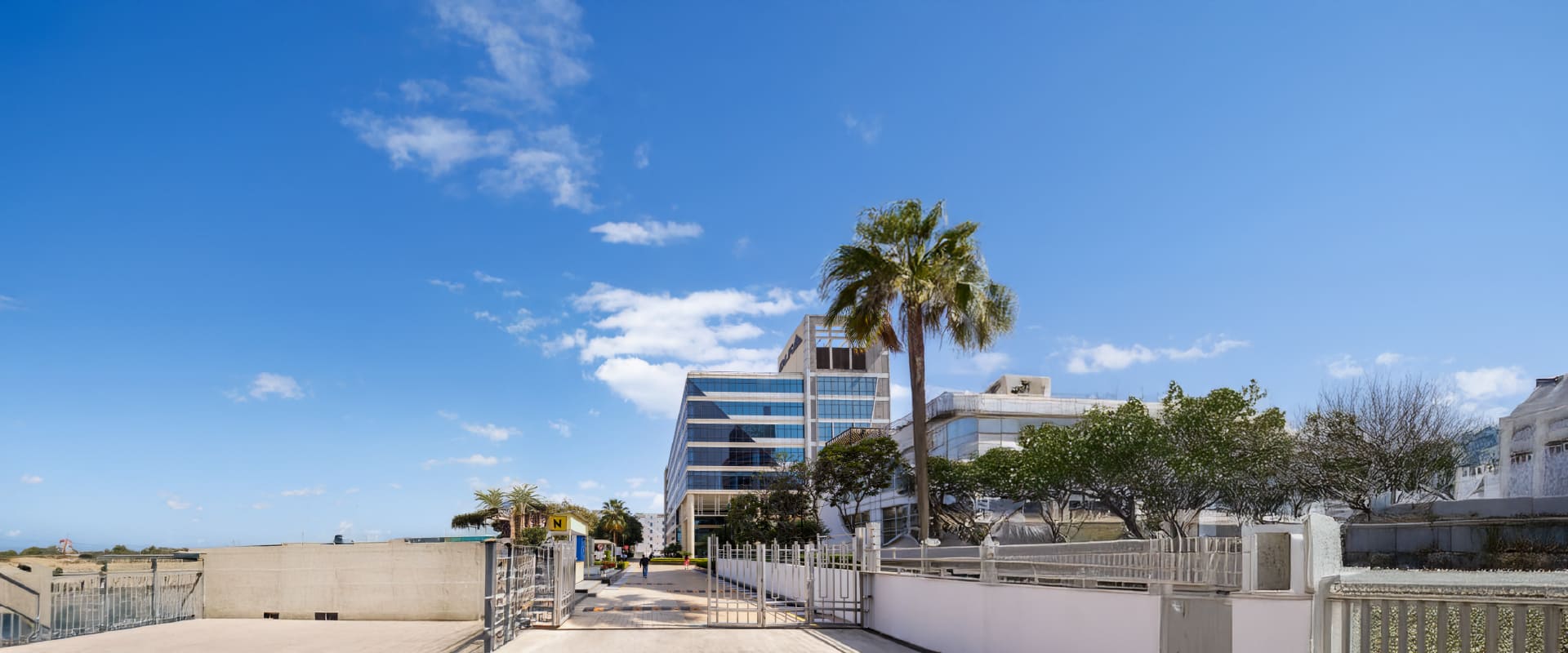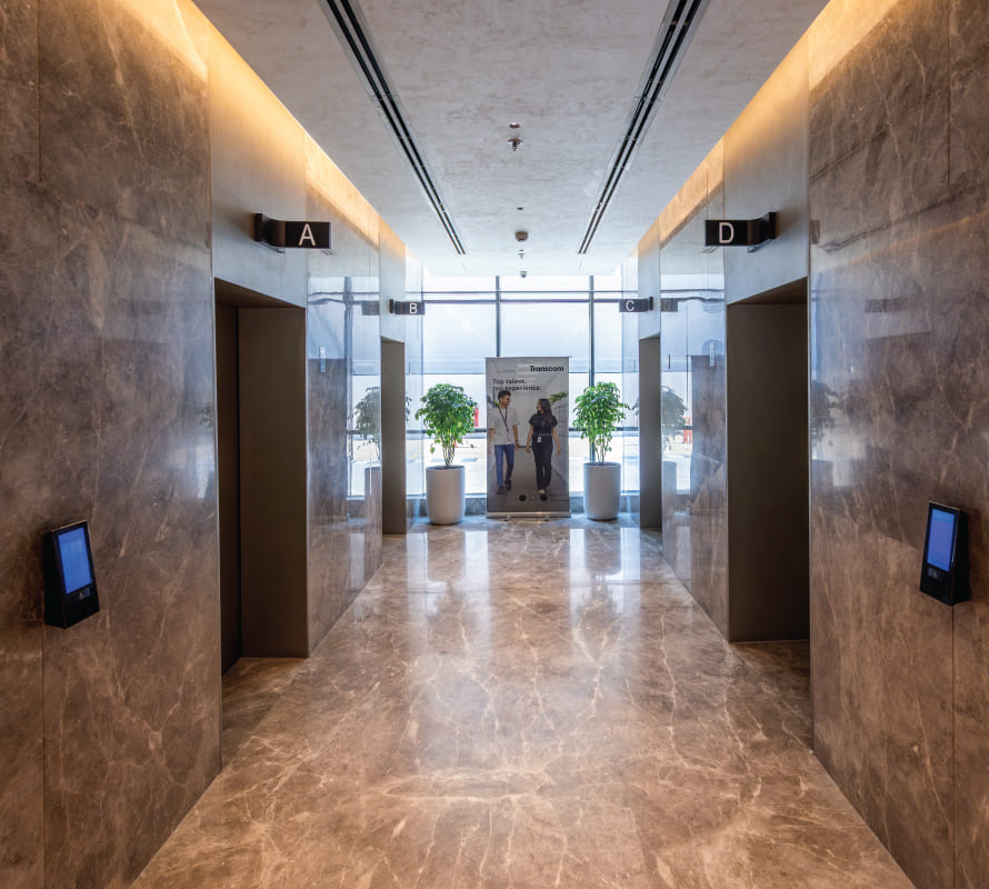 Striking glass facade, grand entrance, atrium, and lift lobbies