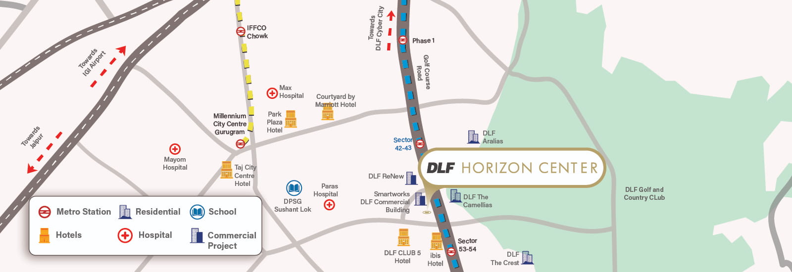 DLF Horizon Center stands at one of Gurugram's most prestigious and luxurious addresses - Golf Course Road. Located near the Delhi-Gurugram border, it offers exceptional connectivity and seamless accessibility.