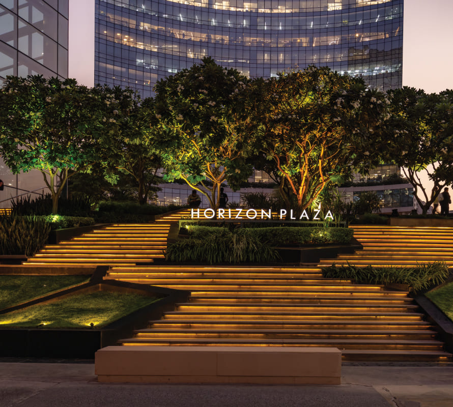 The Horizon Plaza offers a heavenly experience for anyone visiting a corporate office in Gurgaon. Approaching the plaza via grand stairs, visitors are greeted by the soothing sight of magnificent trees and the calming sounds of several water features. The space offers a variety of culinary and leisure options, including a garden café, thoughtfully designed sit-out areas, and seating arrangements perfect for relaxed conversations by day or by night, when the curved plaza takes on an even more magical atmosphere.