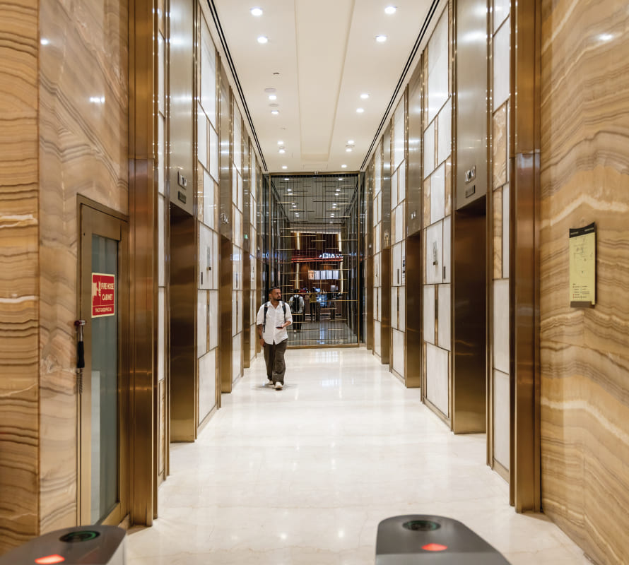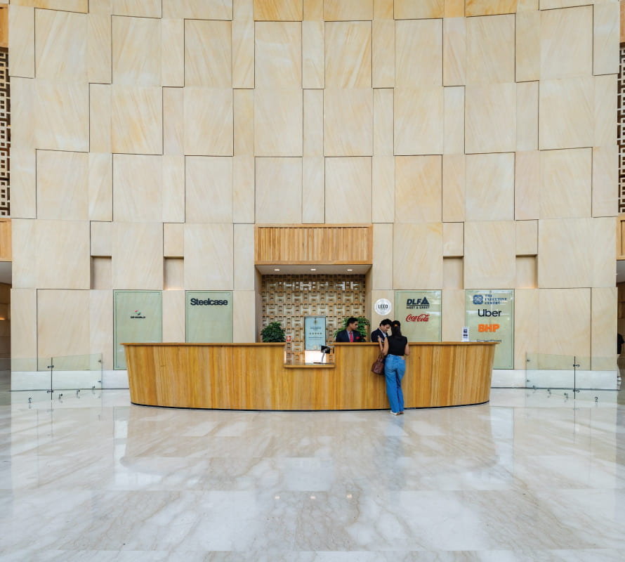 Its scale, design, and meticulous attention to detail make it the ideal office space in Gurgaon. For passers-by, the curved glass façade of the crescent-shaped tower is a striking visual, rising majestically into the skyline. The moment you drive into Two Horizon Center, you realize you've arrived at a special destination. Before you can fully take in the architectural beauty, you’re greeted by a grand arrival concourse, fit for a motorcade. The prominent waterfall feature, along with the lush landscaping, completes the remarkable entrance.